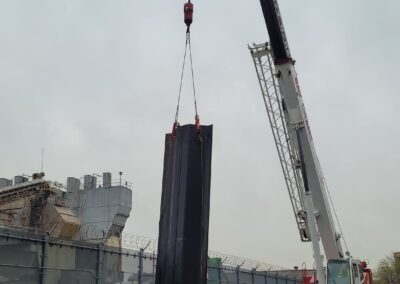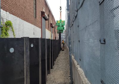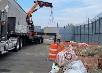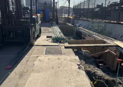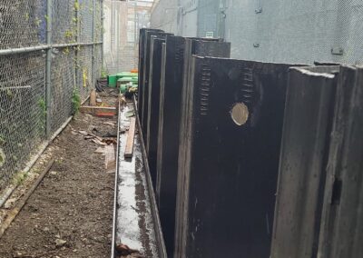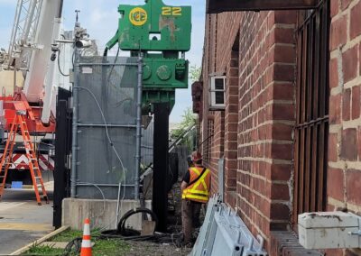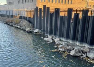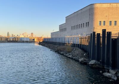 The scope of work included a wide range of architectural, civil, structural, mechanical, electrical, and drainage system enhancements. Central to the project was the construction of a new flood wall system around the perimeter, incorporating precast concrete panels, sheet piles, and H-piles to form a robust protective barrier. The structural foundation of this flood wall required specialized pile cap foundations to support the H-pile system along Metropolitan Avenue, ensuring long-term stability against high water levels. Additional work included the installation of two pump stations in the facility yard, designed to manage site drainage and pavement water control as specified in contract drawings.