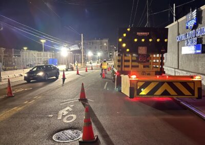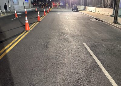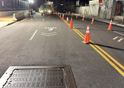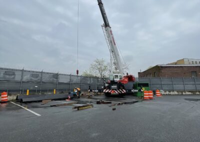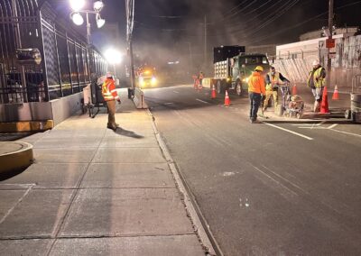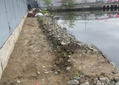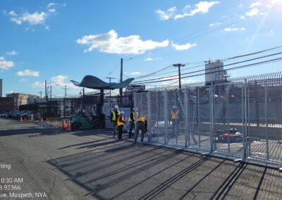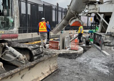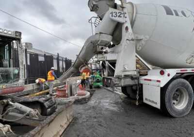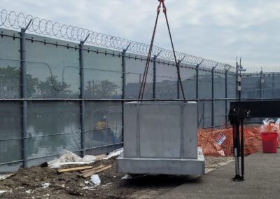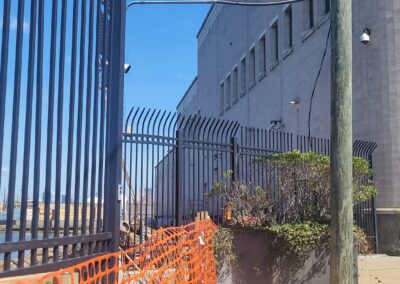 Security and operational functionality were also priorities, with the installation of new perimeter security fencing with security strips, floodlights along Newtown Creek, and a wrought iron-style aluminum fencing system with a concrete base to enhance both safety and aesthetics. The electrical scope included comprehensive details for the new pump stations and relocation of all affected utility crossings to support uninterrupted facility operations.